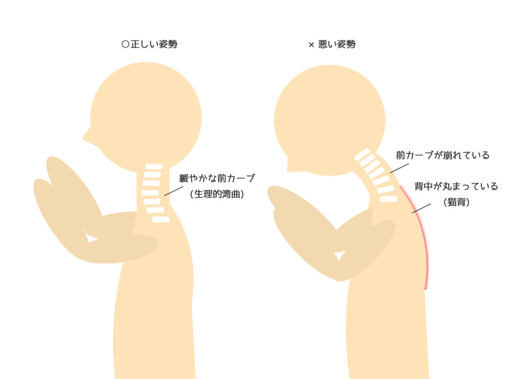 首の骨(頸椎)は、本来ゆるやかに前へカーブしています。このカーブは、重たい頭(体重の約10%ほど)を効率よく支えるためにとても大切です。